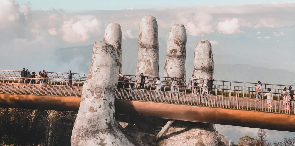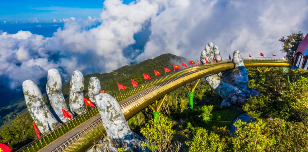 Begin an exploration toward Vietnam's Golden Bridge, a marvel of architectural ingenuity and natural beauty. Perched high above the lush Ba Na Hills near Da...